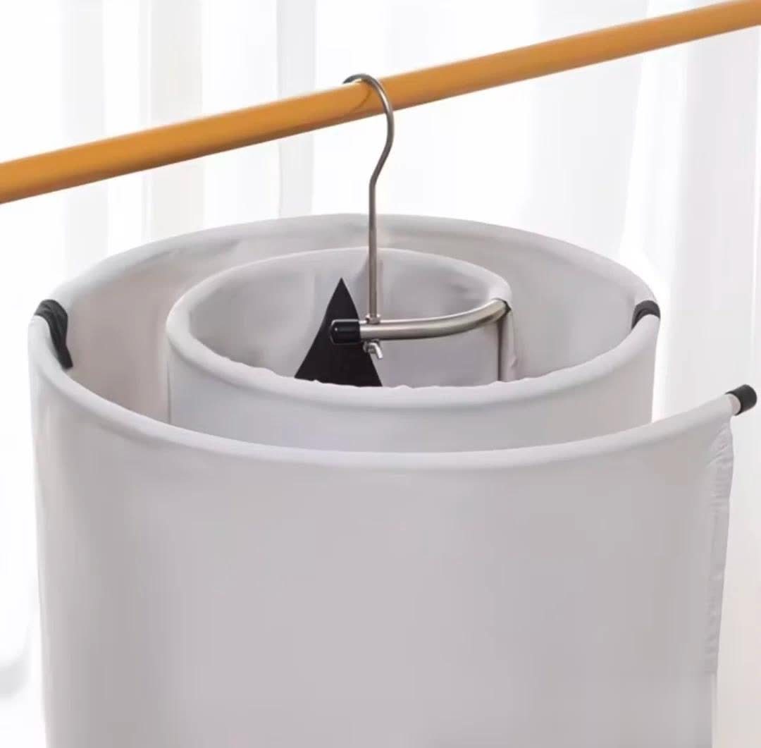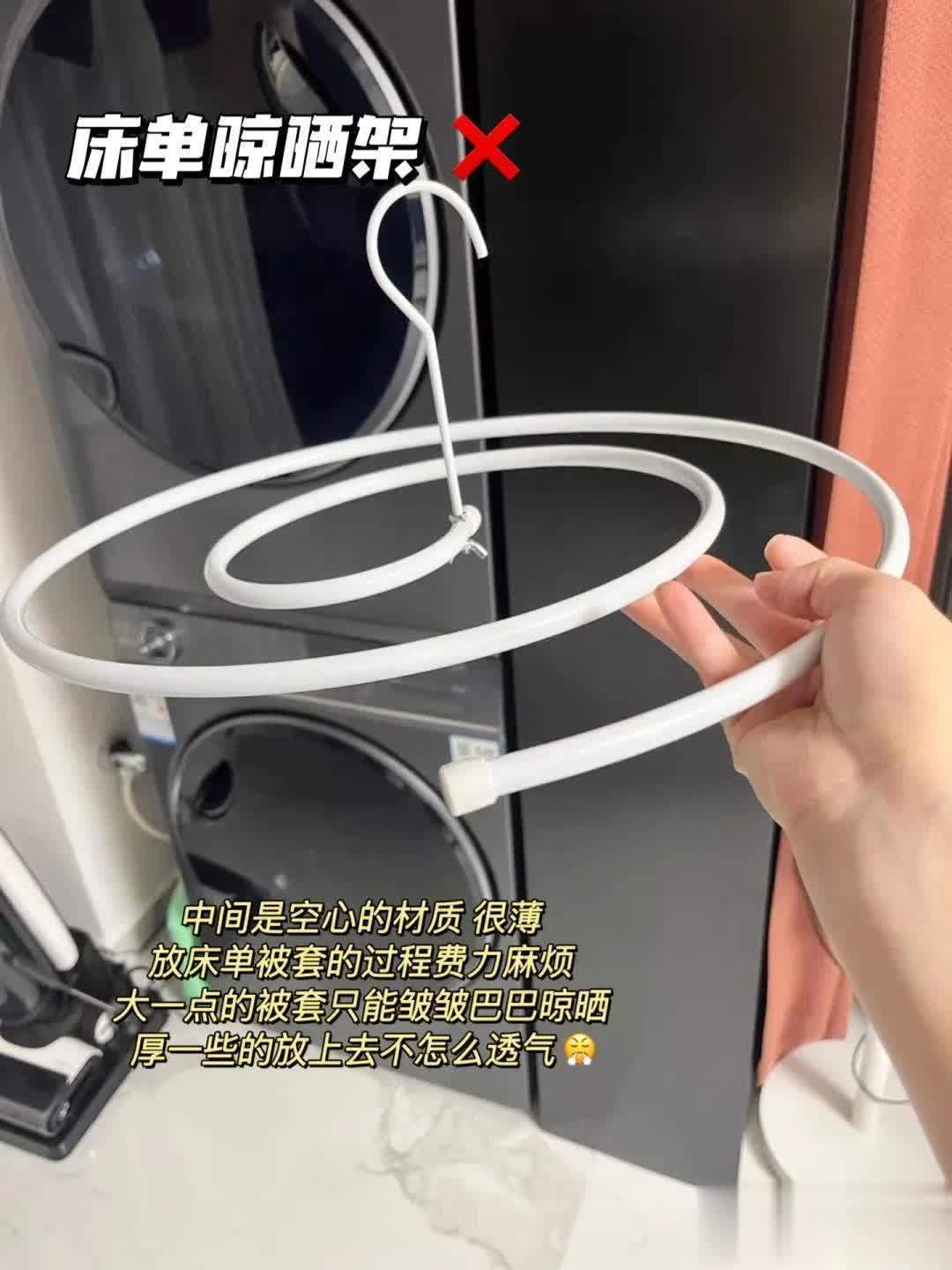 于是这种旋转设计的晾床单神器出现了,它能将床单旋转搭在衣架上,节省空间。