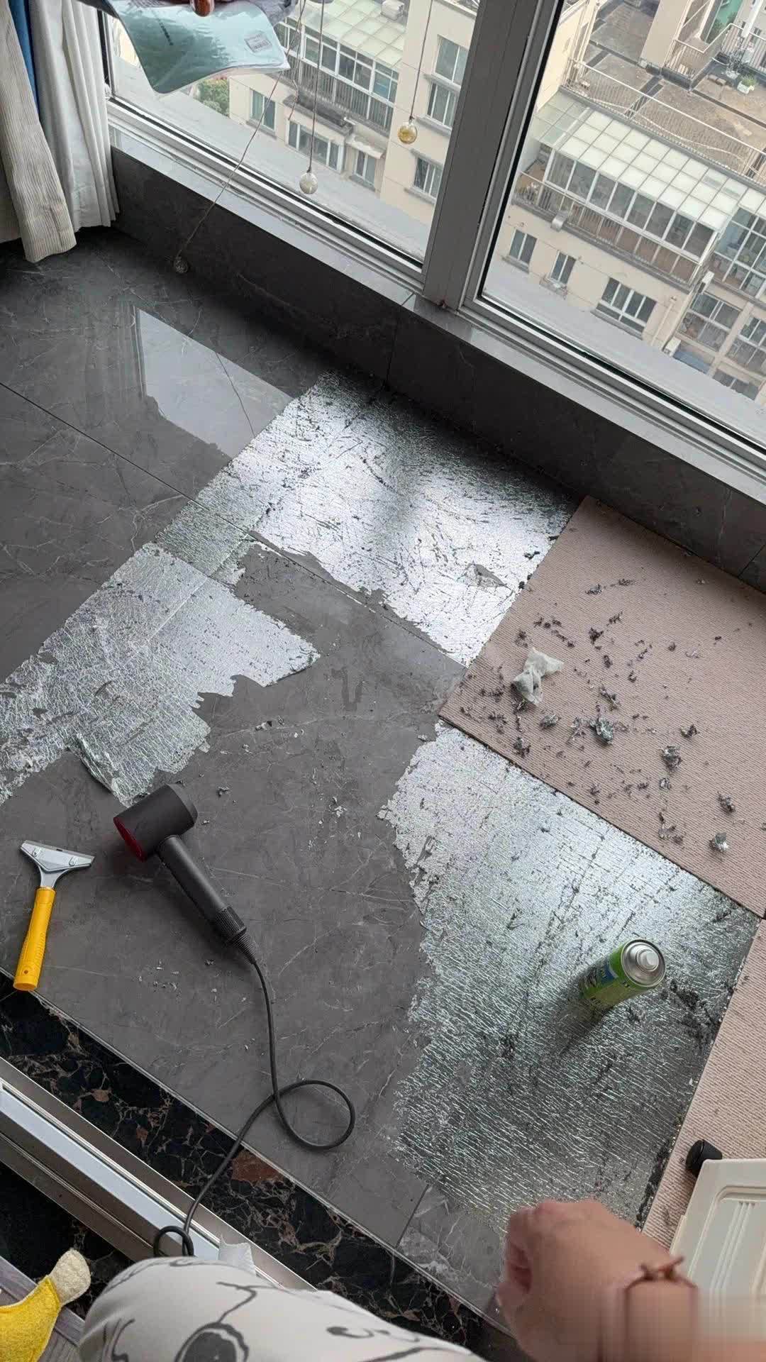 无论怎么扯,用吹风机加热还是用铲子铲,带胶的那层始终紧紧扒在地面,这哪是方便生活,简直是找麻烦。