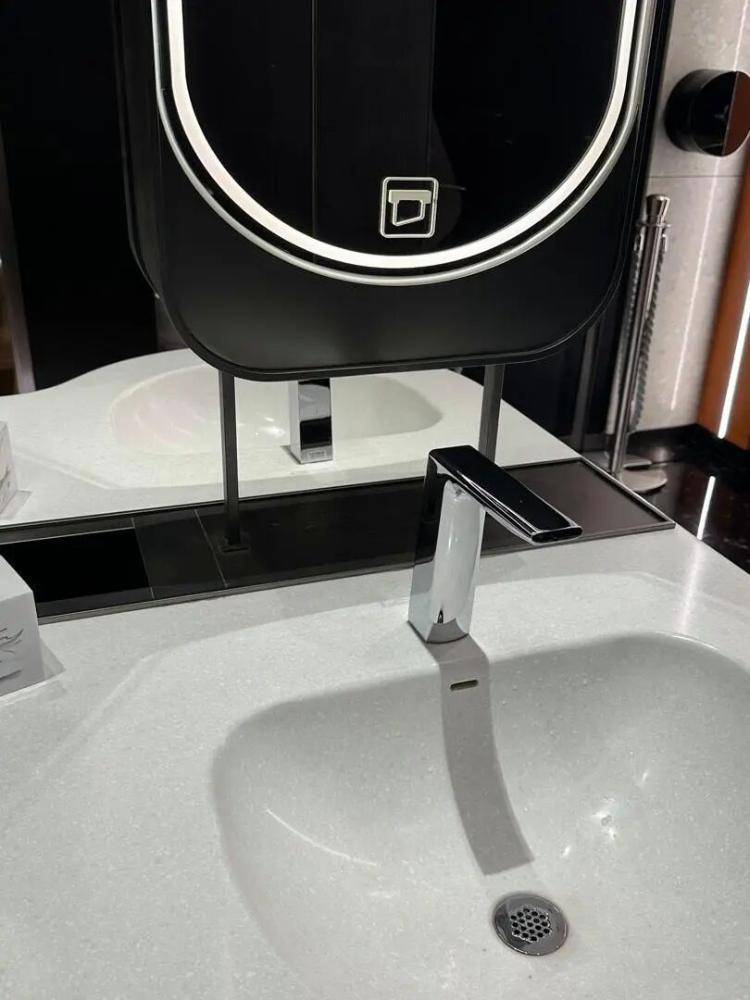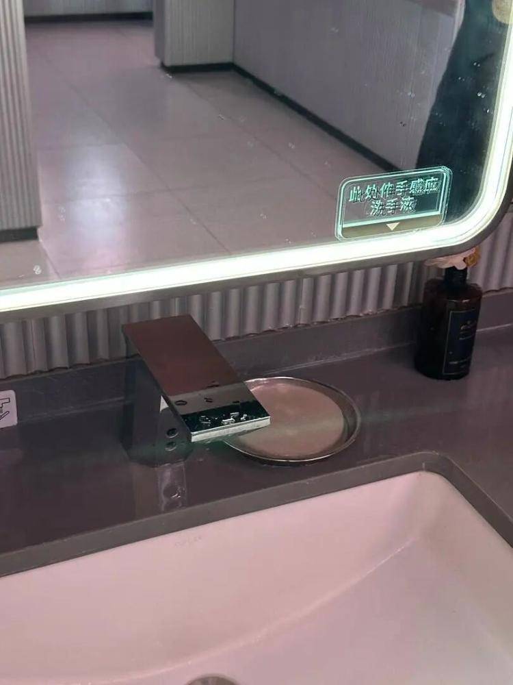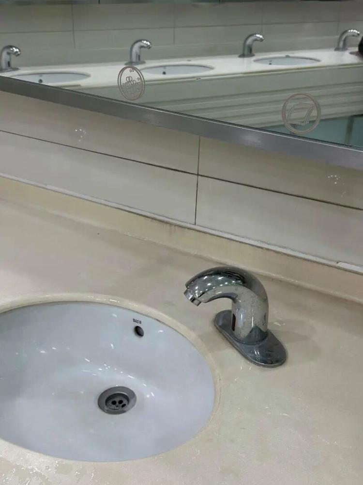 这里感应水龙头的设置也不太合理:感应区不在出水口处,而是在水龙头阀体下方的“两个点”位置,且阀体整体向前倾斜,位置靠里,这都不便于触发感应。有顾客上下来回反复尝试后都没有出水,经保洁员提醒,才找到感应区。“经常有顾客找不到,有人就对着水龙头拍拍打打,还误以为是没水呢,我们总得提醒。”一位保洁人员说。