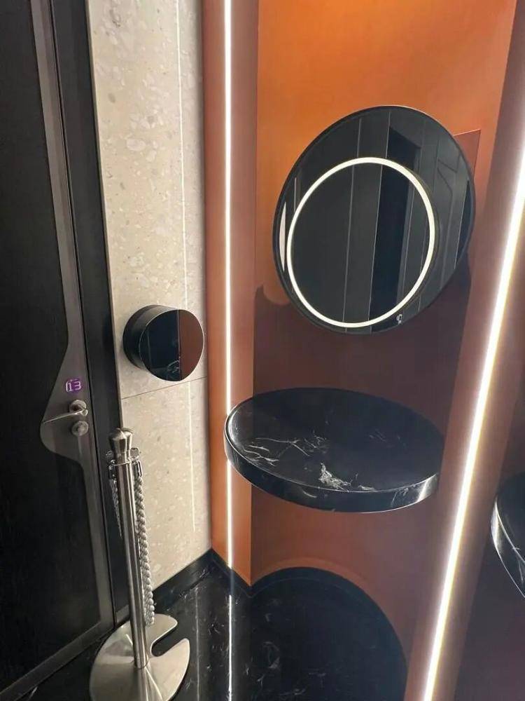 更让人费解的是,在一旁的梳妆台区域,里侧的墙上安装了一台黑色机器,记者试验过之后才发现,其实这是一台干手器。但其设置的位置远离洗手台,而且没有任何标识,如果不试验一下,会觉得这是一个与洗手间的整体风格相配的装饰品,这样的设计就丧失了它原本的实用价值。