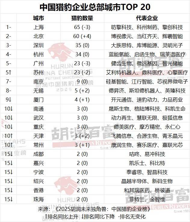 今年全国共有304家“胡润猎豹企业”,这些企业目前估值一般处于3亿至5亿美元之间,且以每年约20%的速度增长。上海依旧是中国猎豹企业数量最多的城市,共有65家;北京以60家位居第二;深圳和杭州分别以35家和34家位列第三和第四。