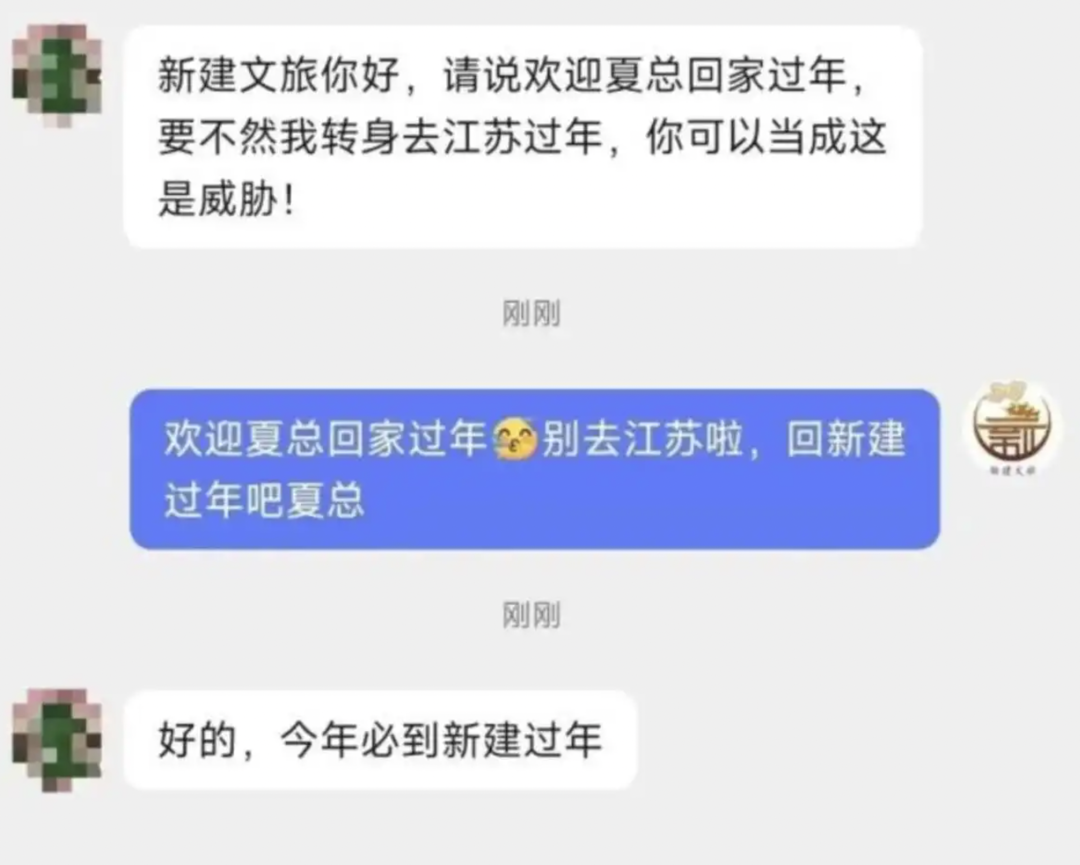 事情是这样的。近日,一名网友向家乡的文旅账号喊话,“新建文旅你好,请说欢迎夏总回家过年,要不然我转身去江苏过年”。令人心头一热的是,新建文旅当真接住了这个梗:“欢迎夏总回家过年,别去江苏啦,回新建过年吧夏总。”