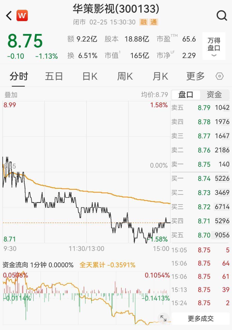 截至2月25日收盘,华策影视股价已5连跌,报8.75元/股,跌1.13%,总市值为165亿元。