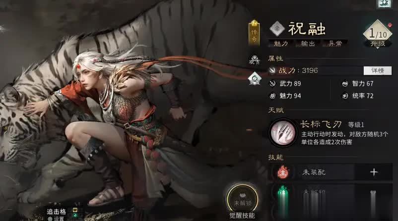 从基础设定而言,祝融的初始战力突破3000点,且会随着等级的成长而持续提升。其攻击与魅力双属性颇为突出,完美契合“美而勇”这一经典标签。这一特质不仅源于文学描写,更有《华阳国志》中“美而勇,善使飞刀,尝于山中射杀猛虎”的记载作为支撑,使得该角色在游戏中颇具文化厚重感。她的核心天赋“长标飞刃”是前期群体输出的得力武器,主动进攻时能对敌方三名目标连续造成两次伤害,清场效率极高,再搭配普攻的法术伤害,构建起了“AOE压制 + 单体补伤”的基础输出体系。随着技能解锁,祝融的战术维度进一步拓展,怒气技能可对敌方全体造成法术伤害,还有概率施加无法驱散的“蛮荒威慑”,限制敌方核心武将的行动与续航,同时附加“蛮血咒”提升目标受击额外伤害。其绝技更能针对不同职业施加减怒、降伤效果,被动技能则可通过触发控制为全队叠加“蛮荒祝福”提速,神兵与藏品技能更是强化了控制稳定性与团队增益,让她从单纯的输出手蜕变成为“控场 + 输出”双能武将。
