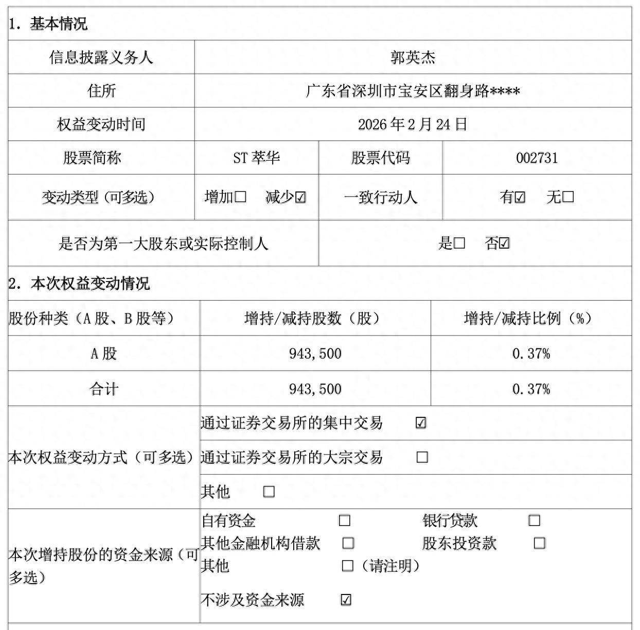 具体来看,公司持股5%以上股东深圳市翠艺投资有限公司(简称“深圳翠艺”)一致行动人郭英杰在广发证券持有的股票账户部分股份被司法强制平仓。本次权益变动后,深圳翠艺及一致行动人股份数量由3376.54万股减少至3282.19万股,持股比例由13.18%减少至12.81%,权益变动触及1%的整数倍。