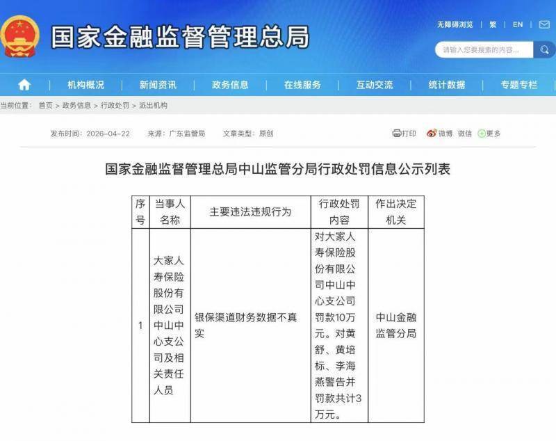 处罚信息显示,国家金融监督管理总局中山监管分局对大家人寿保险股份有限公司中山中心支公司处以罚款10万元;对三名相关责任人员给予警告,并处罚款共计3万元。